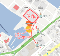 その場所よりさらに海側に、広い空間があります(地図で、JUnHOPPERと書いてある辺り)ので、そこで募金活動を行う予定です。